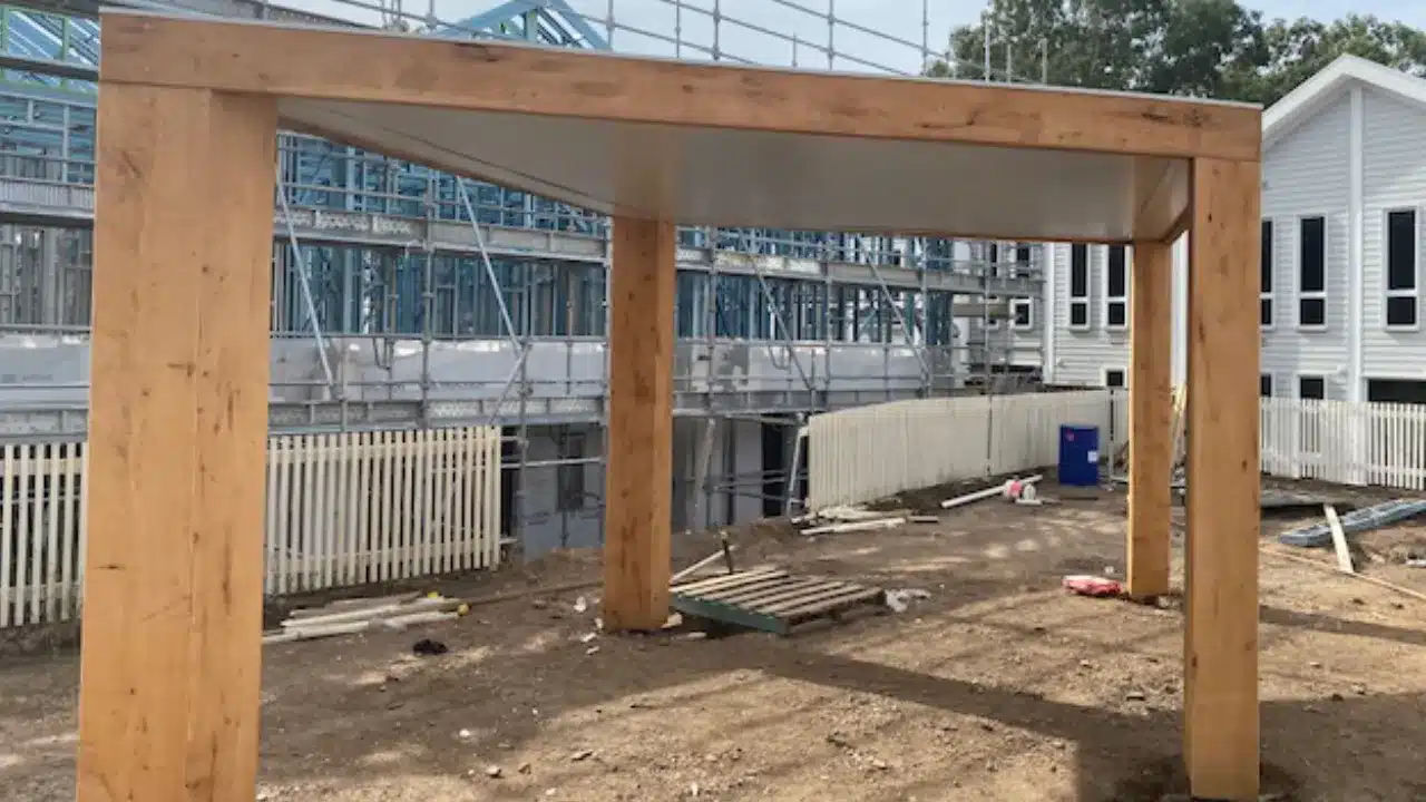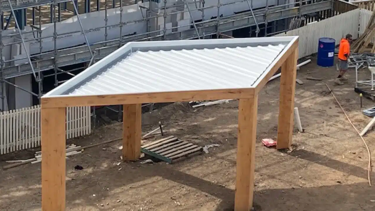 The Sunclipse insulated roofing panels increase comfort levels and the timber posts and facia provide natural elements to work with the planned landscaping.