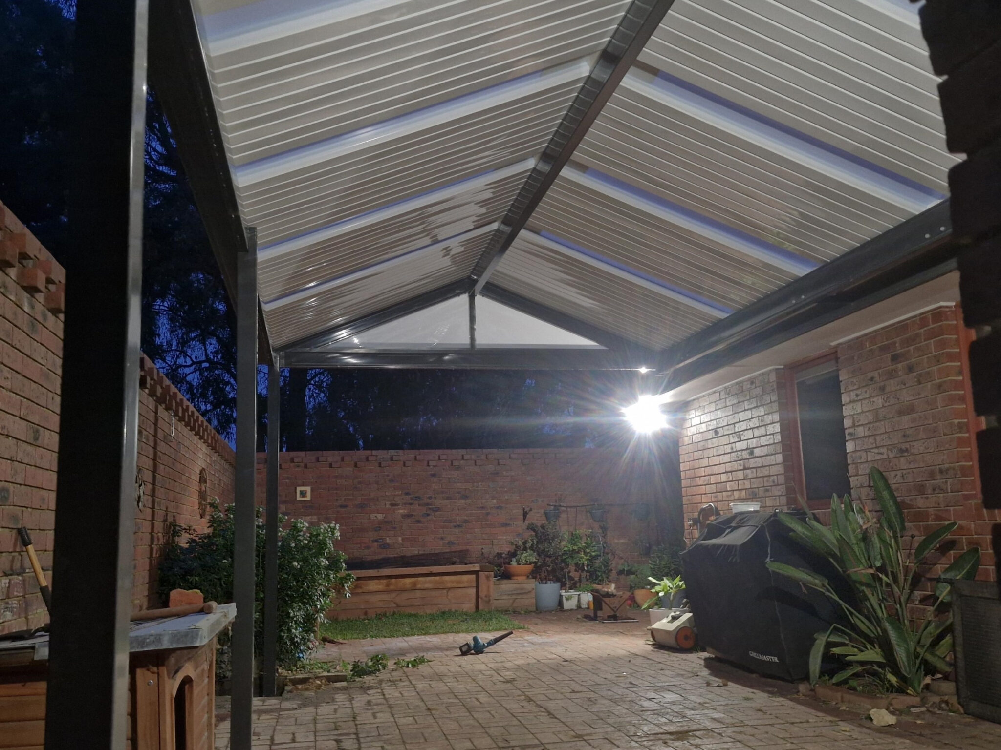 Coolskin steel roofing panels were chosen due to their exceptional value and durability. Naturelite acrylic inserts protect from the elements while maximising natural light. 3x 65mm steel posts support the roof along the boundary and are cleverly positioned to avoid blocking side entry through the brick archway.