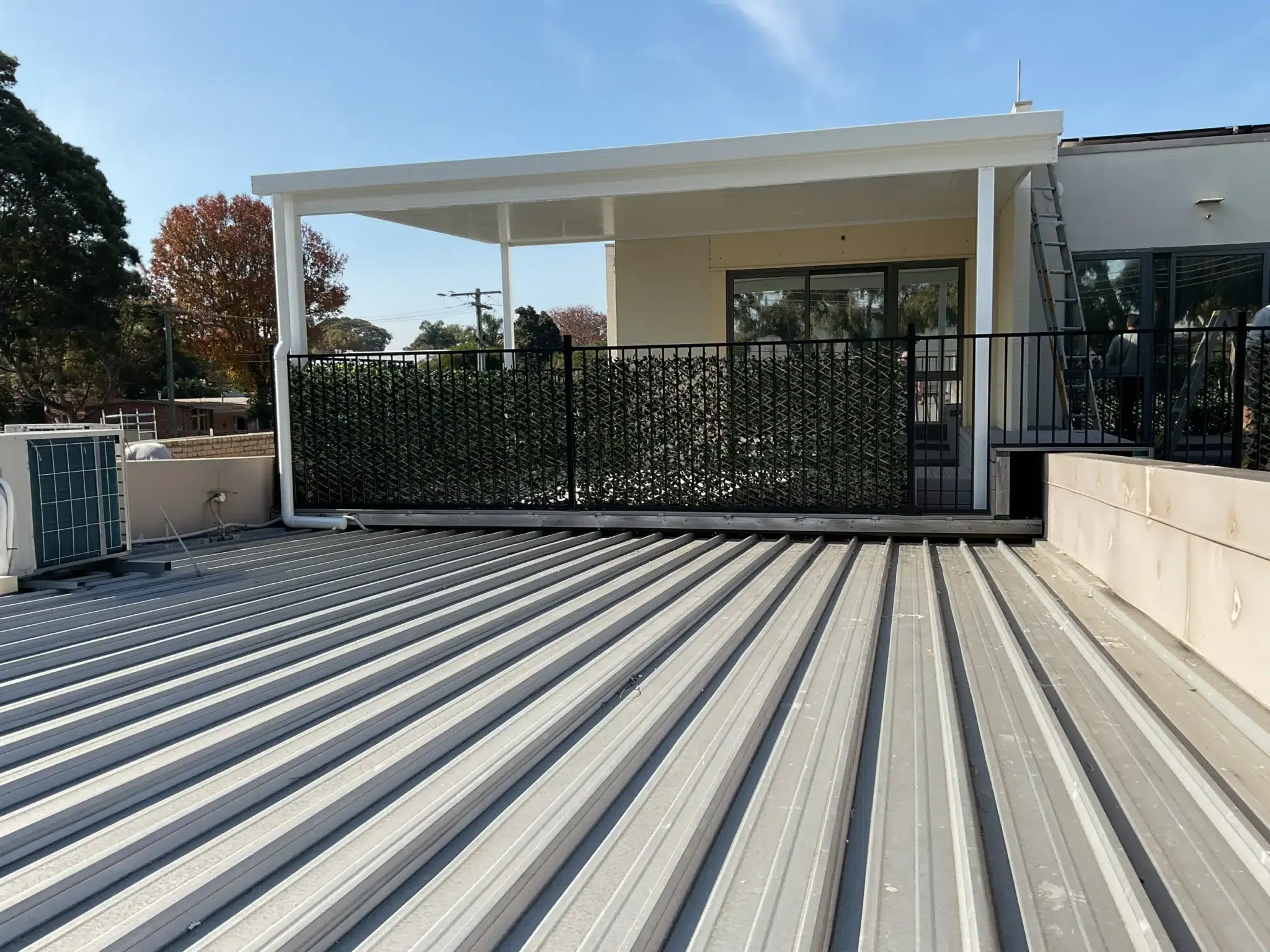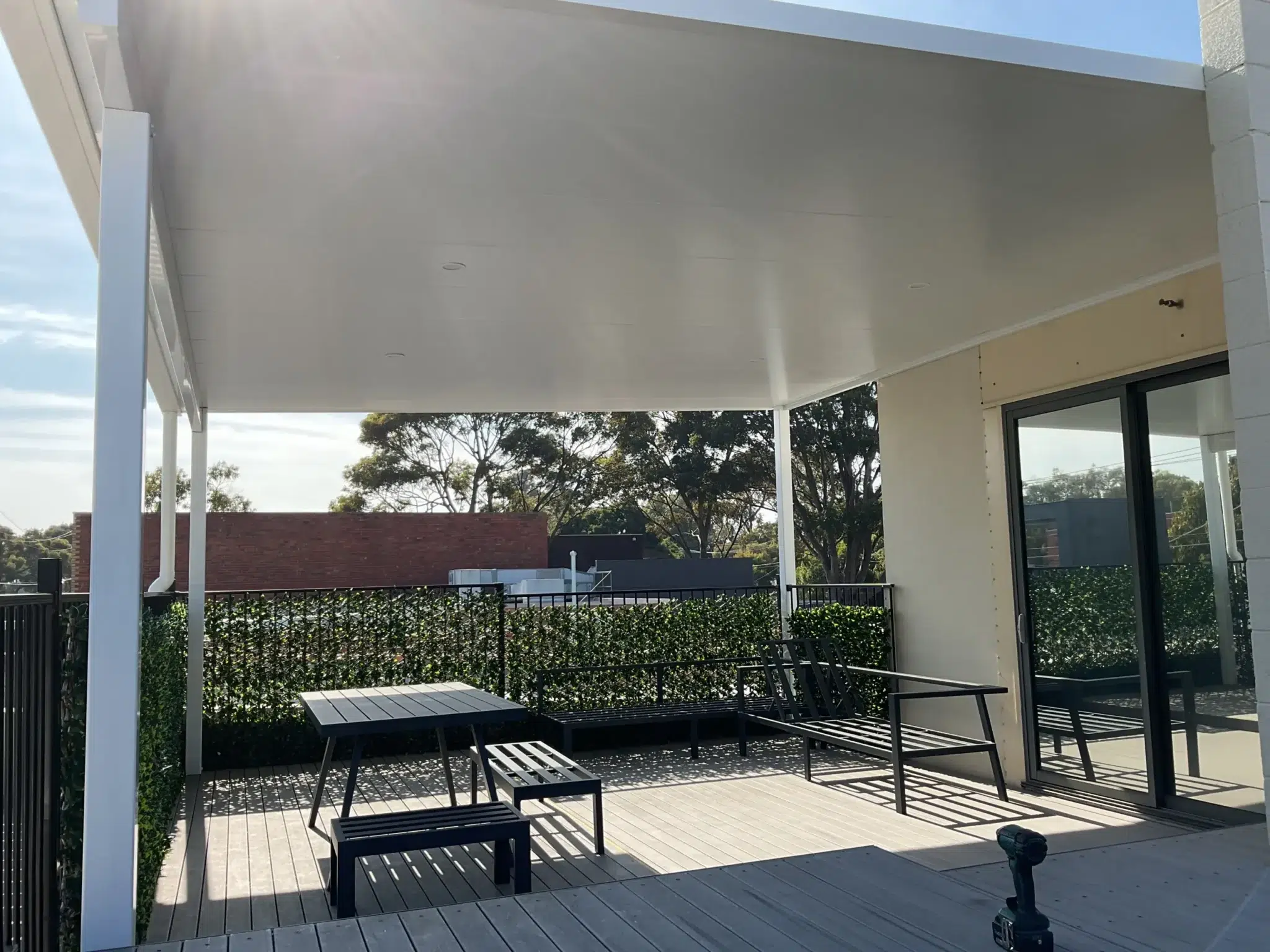 The insulated roofing panels allowed our team to span the full width of the existing deck. Measuring 5.9m wide and 4.9m deep, the 100mm posts were positioned at each end to keep things open and minimise visual clutter.