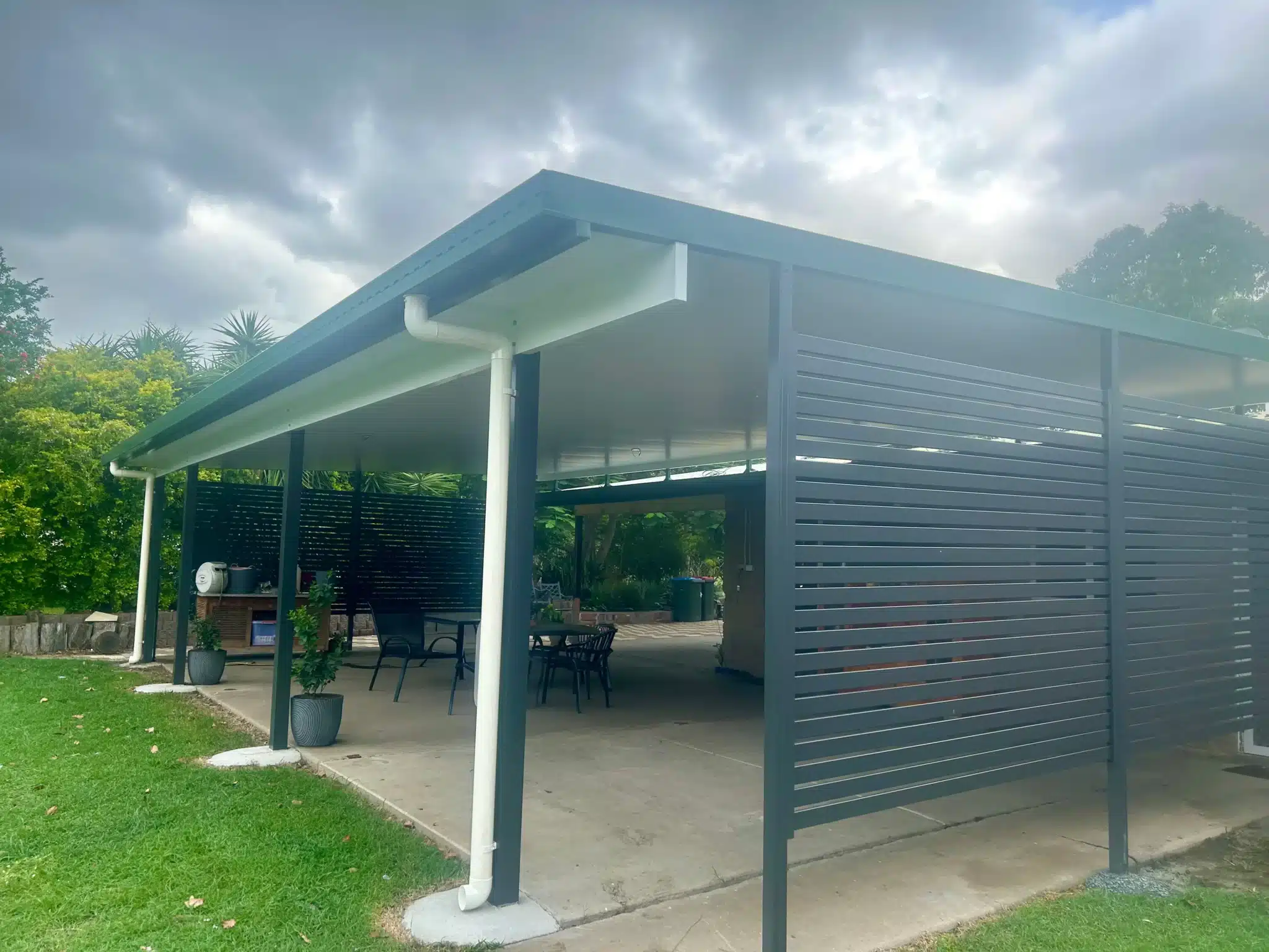 Privacy screens were also added using aluminium slatting. They allow for a modern take on privacy compared to the timber lattice on the old patio.Â