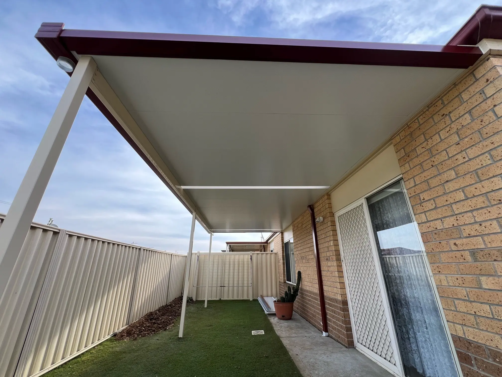 Opting for our 55mm Insulmax insulated roofing panels will keep the summer heat in check while providing extra protection from the winter chill. At just over 7.3m wide and 2.9m deep, our designers maximised the available cover while ensuring council approval would be a breeze.