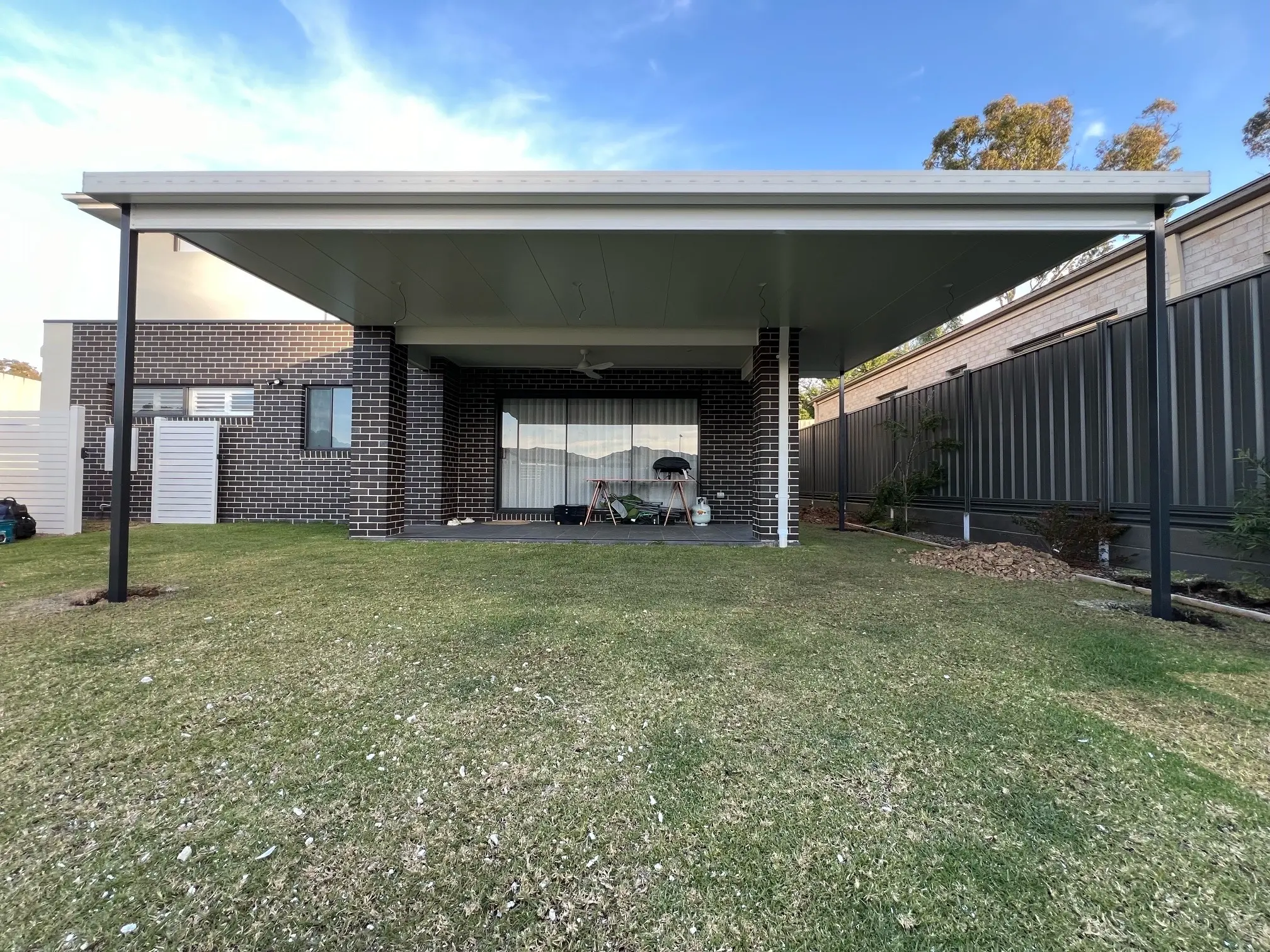 Stage 1 involves an L-shaped, fascia-attached insulated verandah. At its widest point, the new verandah is 7.2m wide and wraps around the alfresco area providing 5.5m of cover. The 55mm Insulmax Insulated Roofing panels protect from extreme temperatures and allow the generous width without the need for a centre post. This cuts down on visual clutter and delivers an uninterrupted view of the garden. White ceilings, roof, gutters and beams are a clean and modern colour choice. The Monument posts are paired perfectly with the steel fencing. When viewed from the right angle they almost disappear entirely from view.