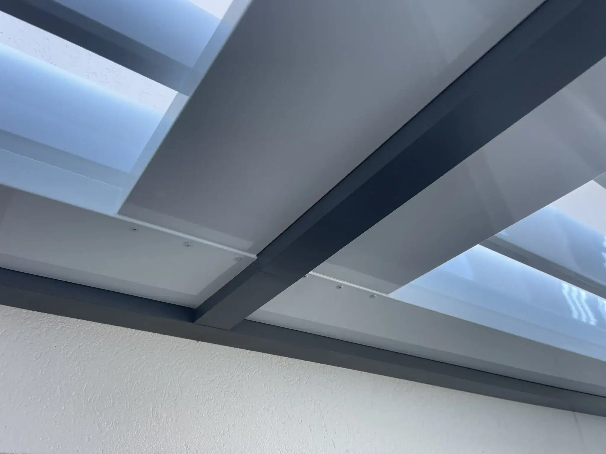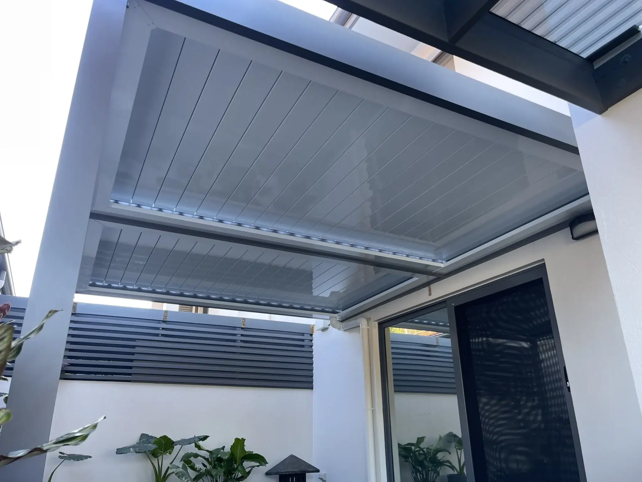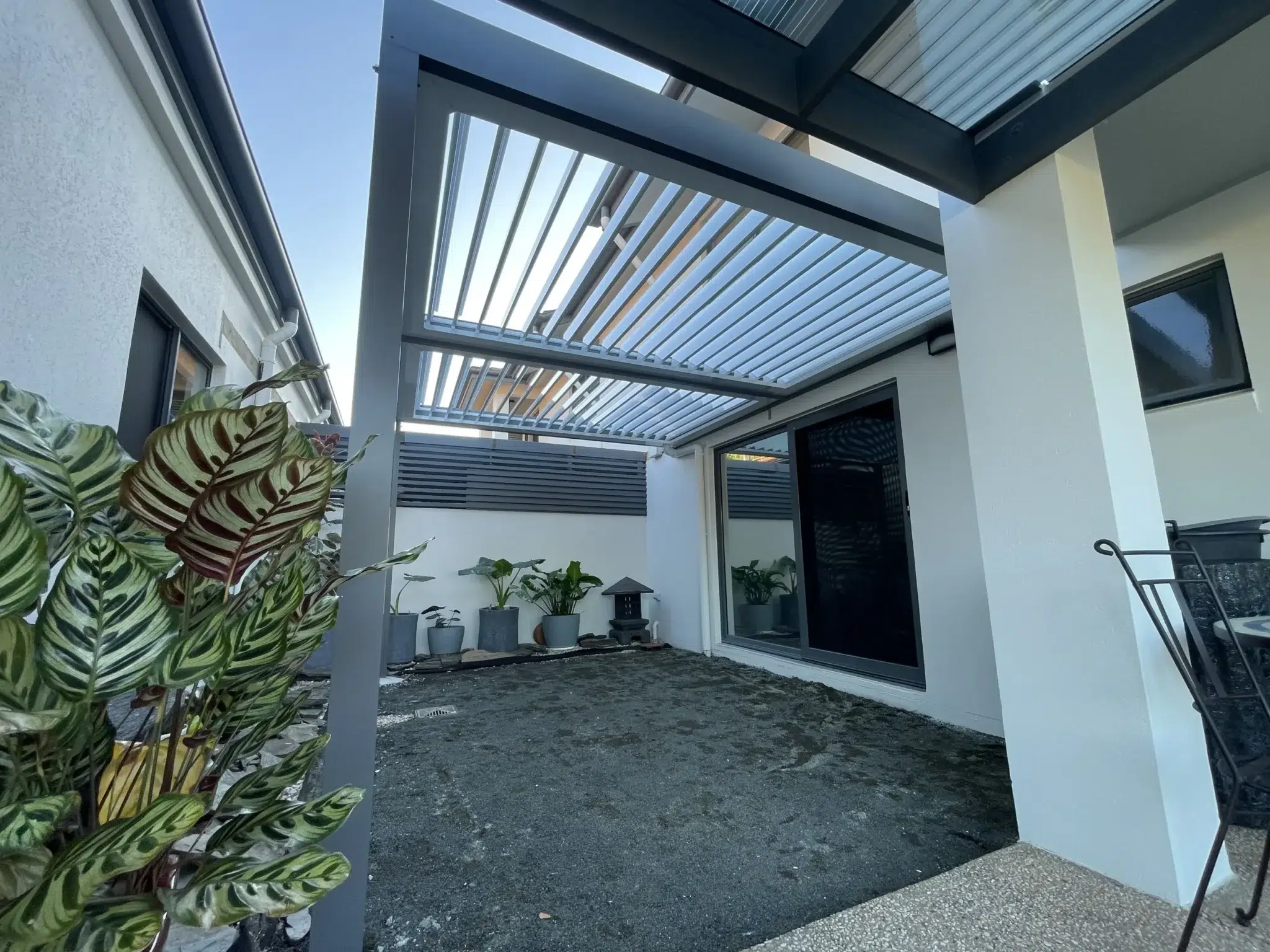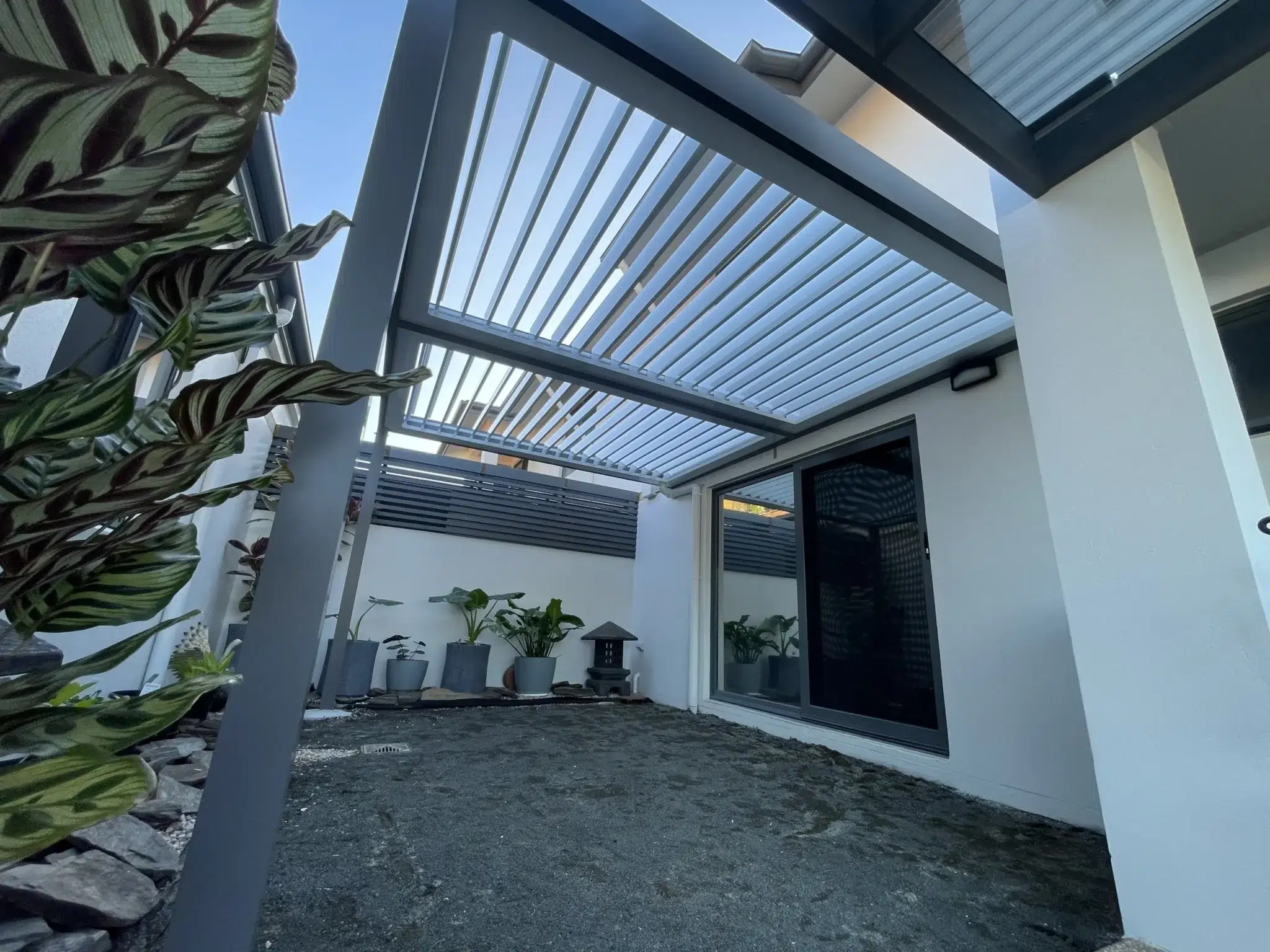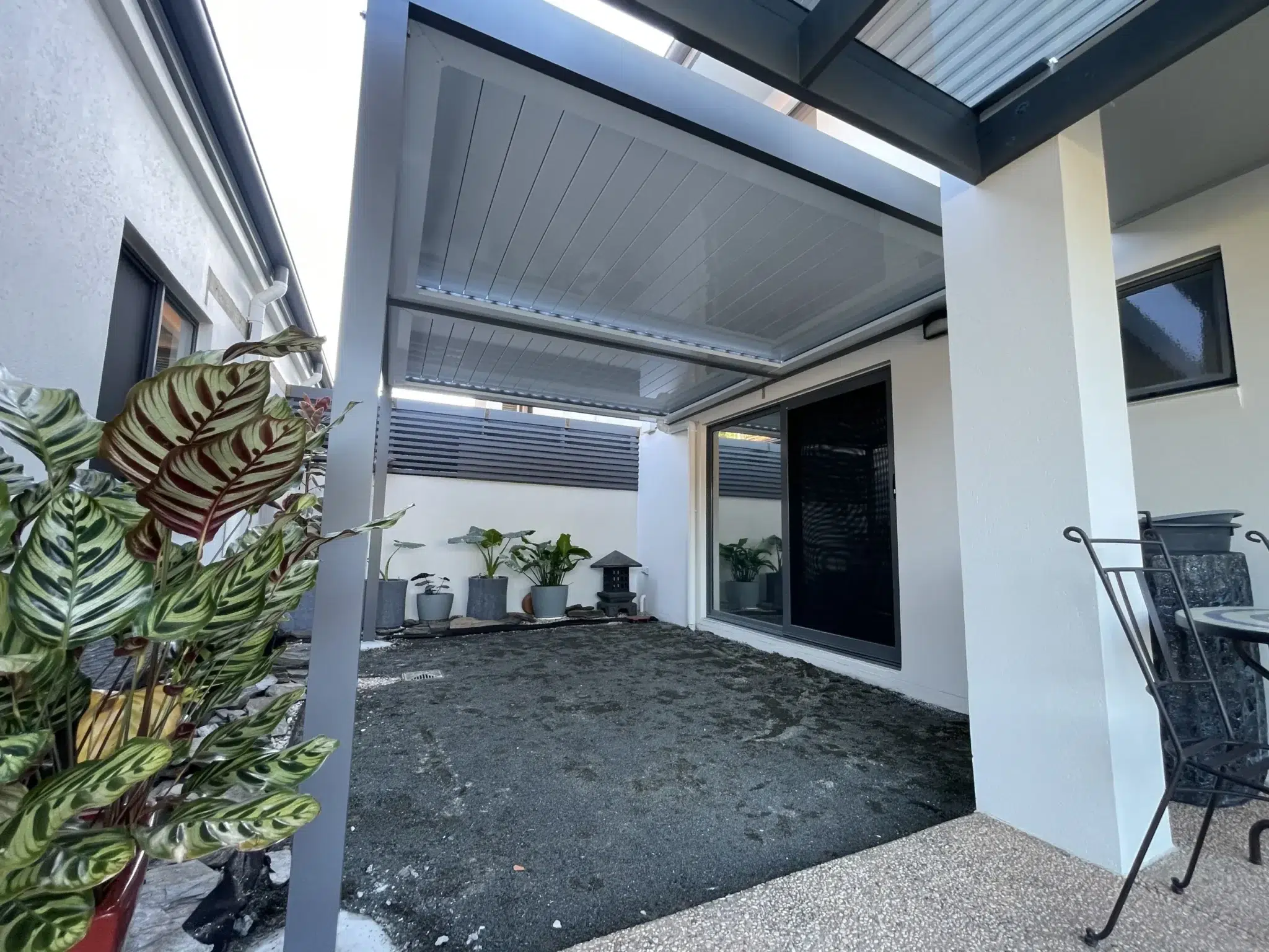 To match the elegantly finished home exterior, Basalt coloured posts and frames are used to support the bright white louvres and gutters.